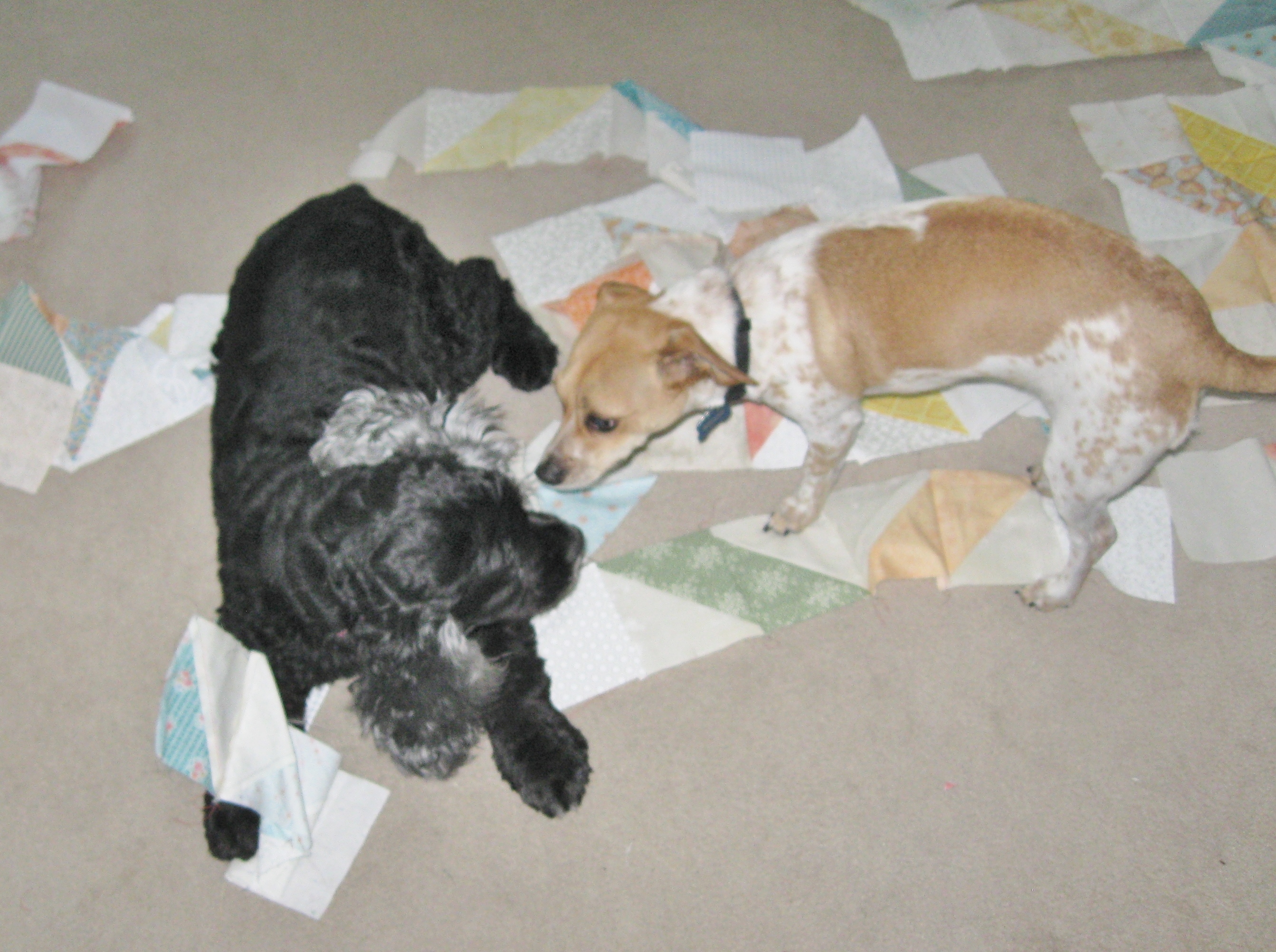 I think the lesson here is that if you’re cooking dinner for your mom, and you’re puppy sitting, and it sounds like all the critters are getting along … then you should immediately run to put away the quilt blocks you left out on the living room floor.
